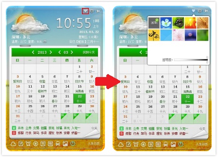 打开人生日历的界面,日历默认设置的是透明的皮肤背景,整体风格走小清新路线,可以看到透明的皮肤背景能够和不同“口味”的桌面壁纸很好的融合,混搭出不一样的味道。在日历界面的右上角还可以找到换肤按钮,我们也可以根据自己的喜好,选择不同的皮肤背景进行设置。