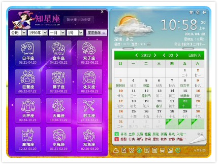 我们可以看到在人生日历界面的下方有一排设计有萌点的功能按钮,除了生活中常用到的记事提醒、节假日安排、预订火车票等日常功能外,我们还看到一个星星图案的图标,这个按钮代表的是什么功能呢?让小编来为你揭晓!点击按钮,在日历的左侧出现了人生日历的星座查询功能——知星座。神秘的紫色背景,把我们带入了一个属于星星的未知世界,在这里我们可以便捷的查询到12星座的运势,配对,以及各类星座相关的资讯,还有不少有趣的小测试,忙碌之余查查星座玩玩小测试也不失为一种很好的放松方式。