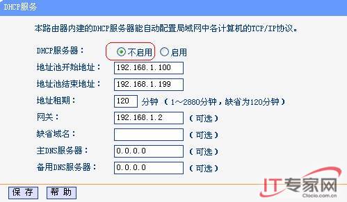 4.关闭DHCP服务器。在DHCP服务器中,选择“不启用”,“保存”,重启路由器。