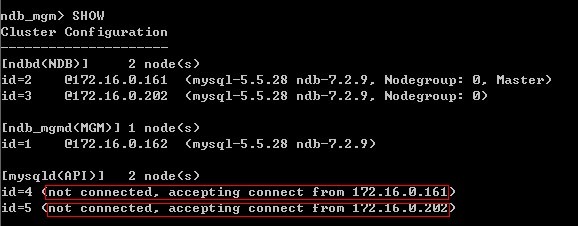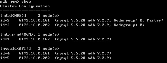 [mysql_cluster] # Options for data node process:ndb-connectstring=172.16.0.162 # location of management server 同理在172.16.0.202机子上配置相同的配置,也可以直接复制到172.16.0.202机子上。