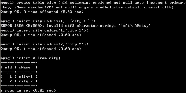 (注:创建表时一定要加上engine = ndbcluster default charset utf8; ndbcluster :表示该表为数据节点可操作; default charset:表示设置字符集)