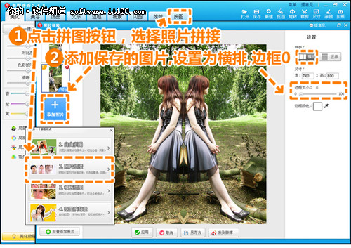 4、点击“拼图”菜单,在弹框中选择“照片拼接”;点击“添加图片”,将刚刚另存的图片载入,将两张图片调整为背靠背的样子,在右方的设置选项中,将排版设置为横版,边框大小调节为0。