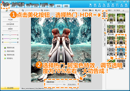 5、点击“美化”菜单,选择“热门-HDR”特效,再选择“热门-阿宝色”特效,将特效透明度调节为70%左右。