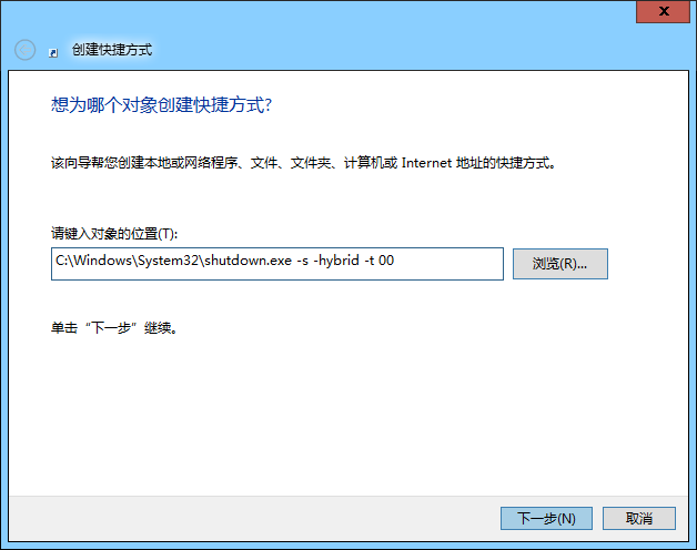 2、在快捷方式的框里填上 C:\Windows\System32\shutdown.exe -s -hybrid -t 00