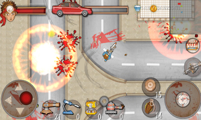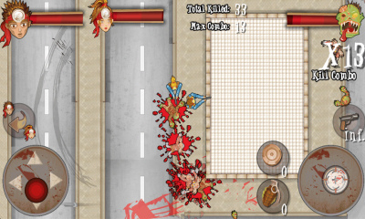 游戏画面为卡通漫画风格,漫画角色造型和僵尸造型,虽然僵尸射击死亡也会出现血花四溅的情况,但是不会给予玩家血腥的感觉。