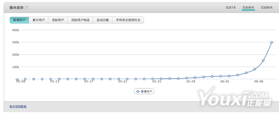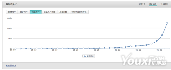 根据“疯狂猜图”开发团队最新提供的数字显示,从5月29号开始,新增游戏用户开始快速增长,6月7日一天的新增用户数达到30万,目前的每日的活跃用户数超过50万。