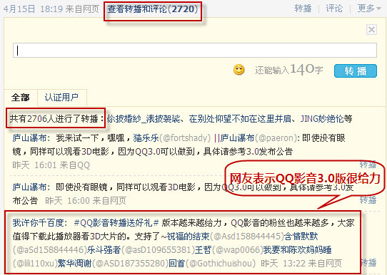 近日,小编在微博上收到许多好友转播关于QQ影音支持3D影片播放的消息,在QQ影音官方微博发布这条广播后,短时间内网友转播、评论多达2700多条,网友们在试用后纷纷表示“QQ影音很给力”。(图1)