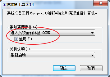 2. 此时会出现如下图所示的窗口,我们单击“系统清理操作”下拉列表框,选择“进入系统全新体验(OOBE)”,同时选中下方的“通用”复选框,再选择“关机选项”为“重新启动”,单击“确定”按钮。