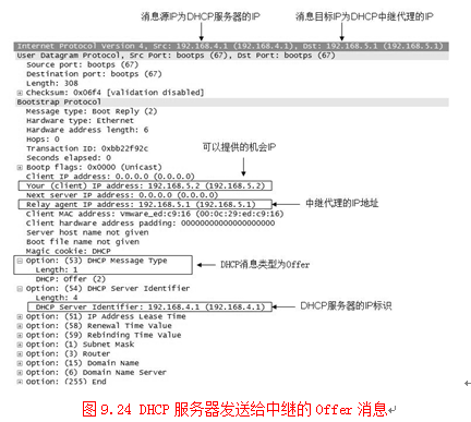 第六步:事实上述第二步到第五步对于DHCP客户端而言是完全透明的,它看不见中继为它完成IP地址申请的过程。它只能看见中继与自己的DHCP消息交互过程,当DHCP的中继成功的从DHCP服务器获得地址后,中继会给DHCP客户端发送一个DHCP的Offer消息,告诉DHCP的客户端可以提供给它的IP地址,注意,此时中继就无需再检测该IP地址在网络上是否有冲突的可能性了,因为这个过程在上述的第三步中已经做了检测。