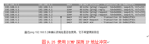 第三步:DHCP服务器会以单播的方式回应中继的Discover消息,并发送Offer消息,该消息中包括了DHCP可以给中继提供的机会IP(192.168.5.2),关于DHCP服务器提供给中继的Offer消息如下图9.24所示,这个Offer消息以单播的形式发送,因为,DHCP服务器知道中继是谁,并且在该消息中包括了中继的IP地址,值得提出的是,DHCP服务器向中继提供机会IP(192.168.5.2)之前,它还是会做一个IP地址冲突检测,它需要知道192.168.5.2这个IP地址,在网络上是否有主机正在使用它,它的检测方式是发送一个目标地址为192.168.5.2的ICMP回显消息,如果没有回应,说明该地址没有被使用,可以被分配出去,反之则不能;DHCP服务器还会检测与中继的连通性,确保中继能成功的得到这个Offer消息,关于这个过程可以通过如下图9.25所示的数据帧证实。在这里DHCP服务器为什么不使用ARP进行IP地址冲突探测?原因很简单,因为在通过中继申请IP地址的DHCP环境中,DHCP提供的IP地址通常都不是本地子网的IP地址范围,ARP不能穿越路由器工作。