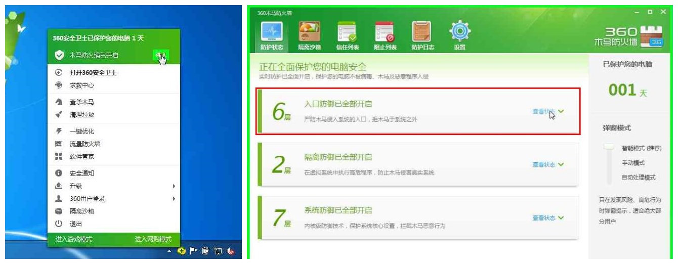 鼠标右击安全卫士图标,进入“木马防火墙已开启”,查看“入口防御已全部开启”状态。