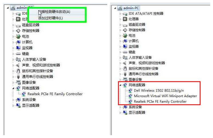 卸载完无线网卡驱动之后,右键单击电脑用户名,点击“扫描检测硬件改动”,等待系统自动扫描安装驱动,安装成功之后,网络适配器下拉菜单会重新出现无线网卡驱动信息。