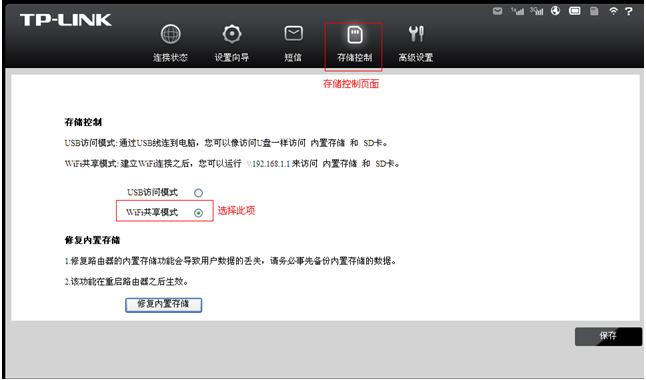 首先登陆TL-TR761管理界面192.168.1.1,在“存储控制”页面,选择“WiFi共享模式”,然后保存配置,然后在无线终端上再来访问TL-TR761的共享资源。