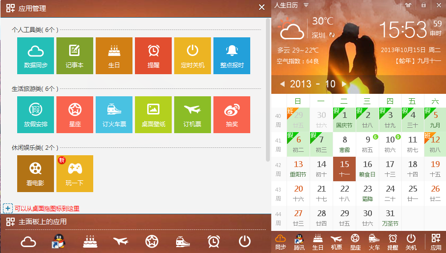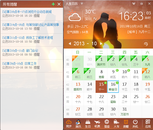 打开人生日历的应用管理菜单,你会发现它的小功能既能让你方便的管理工作,又能给生活带来便利。数据同步、记事本、提醒、定时关机、整点报时可以让你管理好你的工作;生日、放假安排、星座、订火车票、桌面壁纸、订机票等可以让你的生活不再忘东忘西、手忙脚乱。