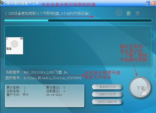 请取出产品,大USB头一头接电脑USB接口,小USB头一头接音箱充电品,放入电池,按电源键开机,LCD屏显示与电脑连接图标,稍等5秒钟后,识别到设备,点击下载,如下图所示