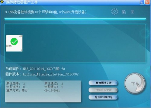 此时,进度条在跳动,窗口中方框中变为绿色图标,并且显示成功,这时候,说明整个机器固件升级成功,可以拔下数据线,接通电源开机,产品可正常使用。