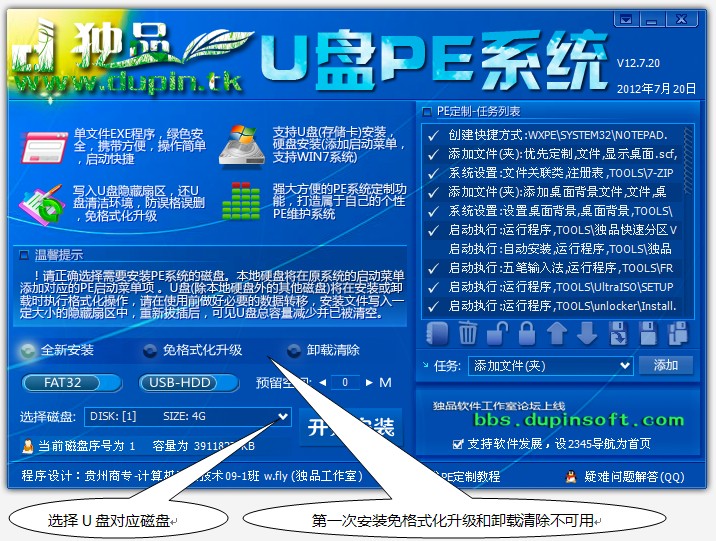 3、运行程序,选择磁盘:做好准备工作后,插上U盘再运行下载的“独品U盘PE系统”程序,在磁盘选择的地方选择U盘对应的磁盘。