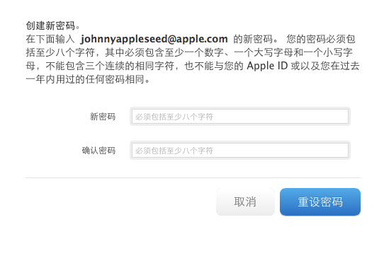 点按电子邮件内的链接或回答安全提示问题后,您将看到还原 Apple ID 密码设置的选项。Apple ID 会以粗体显示。