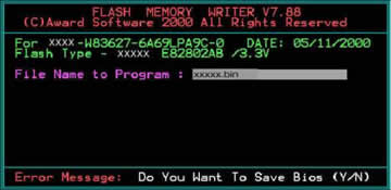 在此画面中的空白处输入由你直接下载的xxxx.BIN文件的文件名。当你将文件名输入完毕后,此程序将自动显示出你所下载xxxx.BIN文件的BIOS类型及BIOS版本。并会在屏幕右下角出现一行提示:“Do You Want To Save Bios (Y/N)”此提示信息是询问你是否保存当前主机板使用的BIOS版本(如下图)。