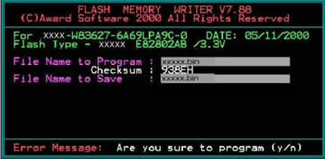 当保存完毕后,AWDFLASH程序将自动对比新旧两个BIOS版本的效验和(如下图)。并且在屏幕的右下角提示你是否要将新版本的BIOS刷进主机板的EPROM芯片中,这时你就按下Y键,等待……