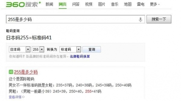 而通过360搜索“潘多拉”,则会将这些碎片化信息进行数据挖掘、精准筛选,在第一列直接告诉用户日本码255=标准码41,还为用户提供鞋码换算器。
