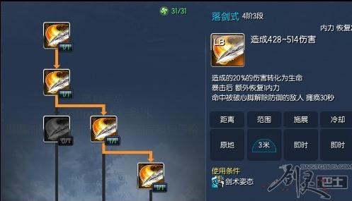 落剑式群攻吸血暴击回2内。没内时只需要砍几刀内就满!