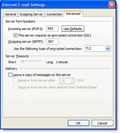 - 点击高级标签,然后选中接收服务器 (POP3) 下此服务器要求加密连接 (SSL) 旁边的框。在"接收服务器"框中输入 995。