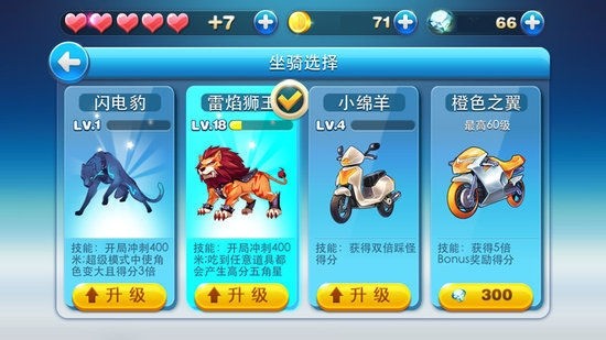 得到道具后,触发让所有金币变成高分五角星的效果,得分利器。全新动物坐骑,开局冲刺400米,吃到任意道具都会将金币转变为高分五角星,从而获得更多表现得分,提升排名噢!