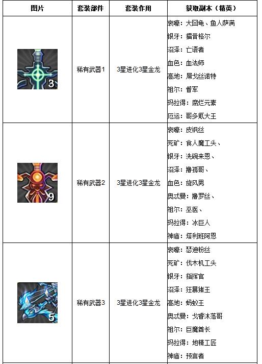 具体的我叫MT online稀有武器获取方式、途径已经为大家从上表中罗列出来了,大家看看缺少什么套装,只要从表中对应进行获取即可。具体也是从哀嚎洞穴到厄运之槌的众多boss,都是进行掉落。需要注意稀有武器套装不同于之前套装,其只有boss掉落而不是关卡掉落。所以相对来说精英副本的boss,其掉落几率要大的多。