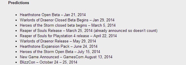 日前,国外著名的暴雪资讯站blizzpro.com在其官方网站上公布了自己对暴雪2014年的游戏计划作出的大胆猜测。他们预测《炉石传说 》将于1月21日开启公测,《魔兽世界:德拉诺之王》则会在1月29日进行封闭内测,而另一款新游《风暴英雄》则会在3月5日进行封闭内测。