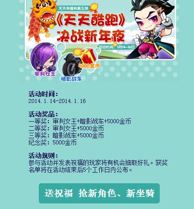 各位天天酷跑游戏玩家福利来了,腾讯将在近三天推出决战新年夜的活动,活动将会有各种奖品及礼包领取,天天酷跑活动决战新年夜 新坐骑新角色。