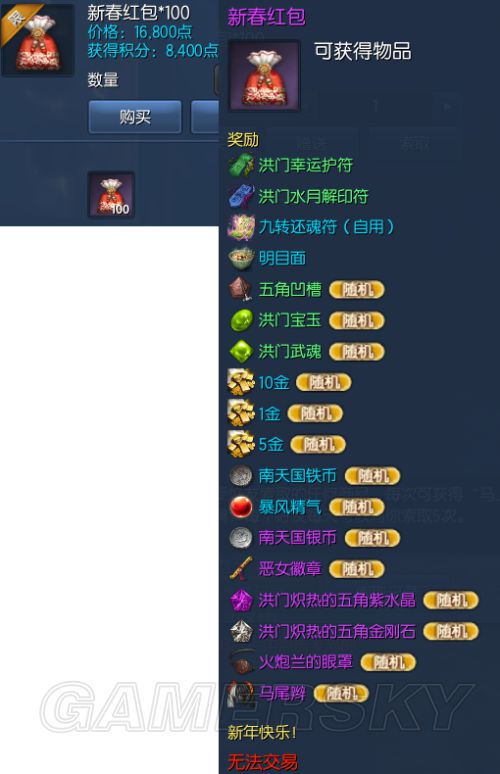 剑灵火炮兰大礼包 剑灵新春版本各种礼包大全。先看168RMB的 "新春红包(100个)"。 TIPS:必出+50%饲料经验的洪门护符。