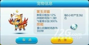 天天酷跑黄玉灵猫是PVP版新宠物,月亮级别品质。增益方面,300%的飞星德得分还是很给力的,爱心恢复缩短的技能,对于小伙伴多的玩家没有实质意义。最让人心得的是,黄玉灵猫每6小时可以产生3钻石。就凭这一点,直接让它成为新版本中大家最想得到的宠物。