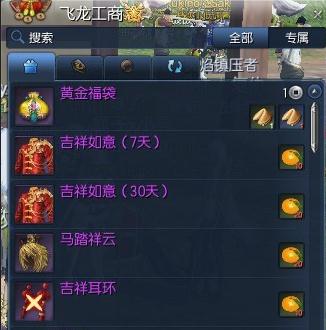大家可以按I键打开包裹界面,然后点击下方的飞龙工商面板:兑换黄金福袋需要使用1个好运连连和1个财源广进和1Y的费用。
