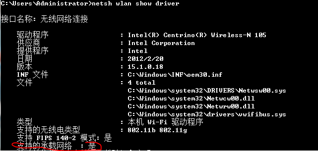这里我们尝试用命令netsh wlan show dirver,假如这里的“支持网络承载”为“是”的话!则是可以把笔记本设置成无线路由器。