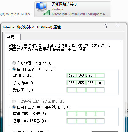 (3)我上面设置的热点名称是skytina,这里是虚拟机网卡设置的ip192.168.23.1