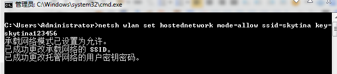 netsh wlan set hostednetwork mode=allow ssid=skytina key=skytina123456