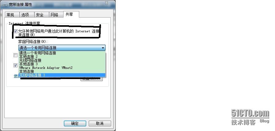 接着切换到共享这个选项卡,在“允许其他网络用户。。”那里勾选上,选择虚拟网卡。这里是无线网络连接3