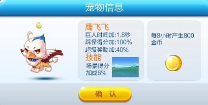 鹰飞飞的增益效果为:巨人时间+1.8秒——踩怪得分+100%——超级奖励+40%。拥有在特定场景下得分+6%的技能。还可以每8小时产出800金币的产出技能。