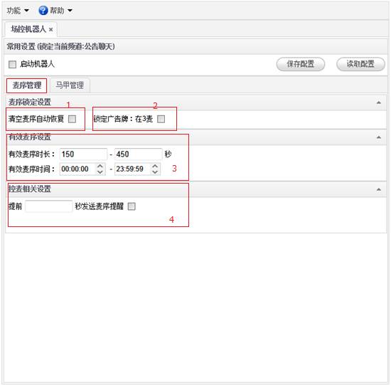 1、【清空麦序自动恢复】,如要开启此功能,就勾选后面的选框。此功能主要用途在于保护当前麦序不被清空,万一有人误操作或恶意清空了麦序,机器人会按照清空之前的麦序把人员迅速抱上麦;