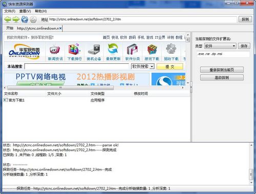 第二步:程序默认会探测指定页面中的图片资源,单击右侧“类型”项的下拉箭头,在出现的下拉菜单中,将类型选择为“软件”,然后单击“重新探测当前页”按钮,有关该网页中存在的EXE、RAR、ZIP或MSI格式的软件资源,就会出现在左侧中间的列表中(如图3)。