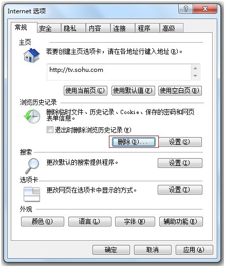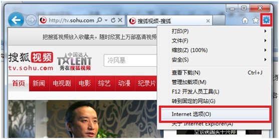 退出搜狐影音后启动IE浏览器,选择“工具—Internet选项”。如图: