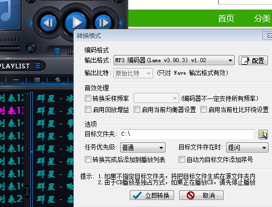有一张CD,想转换成MP3,用千千静听的转换格式功能,为什么显示状态出错?我是选了本地磁盘做目标文件夹的