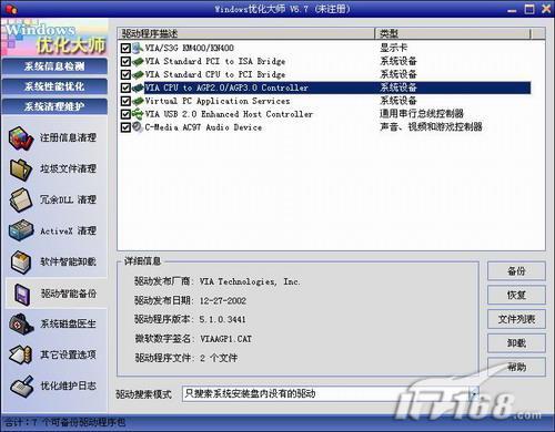 打开Windows优化大师,然后依次点击“系统清理维护――驱动智能备份”标签,就可以看到所有的驱动程序了(如图10所示),然后选择需进行备份的驱动,点击备份按钮就可以了。如果以后进行恢复的话,只需点击“恢复”按钮,然后选择刚刚的备份文