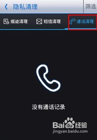 切换到“通话清理”界面清理通话记录,小编的通话记录为空所以不需要清理,你可以使用360优化大师清理指定的通话记录。点击右上角“筛选”按钮还可以对通话记录进行筛选。