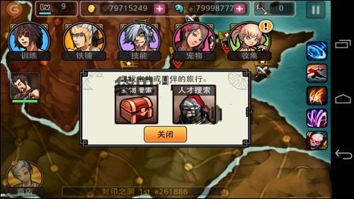 进入到游戏的主界面后,点击右下角的搜索按钮,会弹出一个窗口,玩家可以选择寻找宝物或同伴的旅行(武将)。