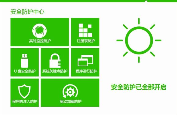 (2)点击盾牌标志,出来的就是安全防护功能界面,界面模仿了win8的形式,当鼠标滑过方块的时候,就出现了详细介绍,也有了开始关闭的按钮,当然,最好是全部开启啦