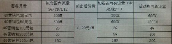 简单解释下 30/50/100/200/300包月分别是300M/600M/2G/5G/10G 如果买4G手机参加活动 连续2年每月赠送相对翻倍流量!