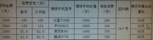 四款手机的合约计划! 如果你买三星的还可以同时办理存100得500活动,买其余三款可以得到减免3个月100元4g流量包优惠!