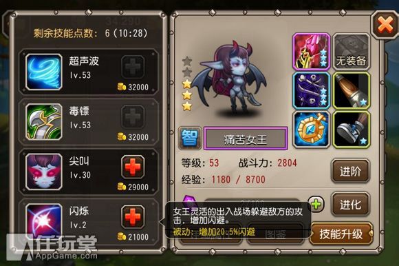 给大家解释下,闪烁并不会想DOTA里那样跳进去,就是个名字,唯一的作用就是增加闪避。有群里的同学还认为会跳进去,岂不是去送死?其次闪烁的成长是按百分比成长!初始20%如果能升到160级,再放到前排……好吧我也夸不下去这个技能了,尼玛女王一个中排英雄要闪避有个屁用!而且这个技能实在是拼脸,脸黑的同学可以不用升了~